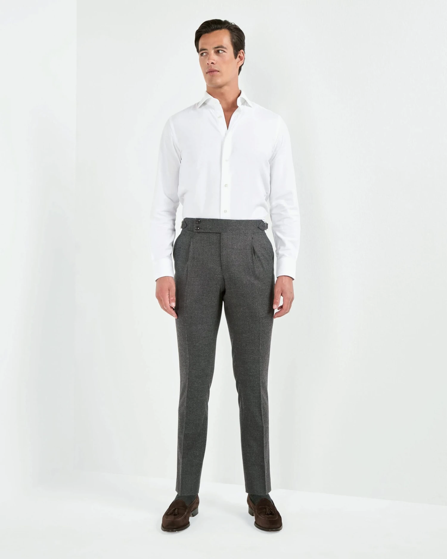 Our iconic Soragna model features a high-rise and a semi-slim fit, a large extended 2-button belt, side adjusters and single pleats. It is the perfect pair of trousers for any occasion and can easily be dressed up with a shirt, tie and jacket or worn casually with a simple shirt or knit.